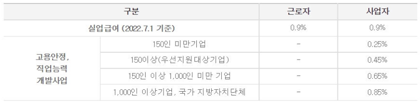 2023년 고용보험요율입니다. 근로자는 0.9%입니다. 사업주는 0.9%+@입니다. 사업주의 경우는 근로자 수 등에 따라 추가로 더 납부를 합니다.