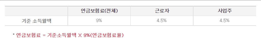 2023년 국민연금요율은 9%입니다. 사업자 4.5%, 근로자 4.5%입니다.
